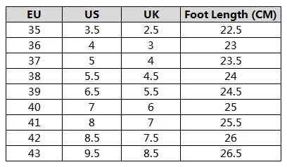 3. po poznaniu długości stopy należy zapoznać się z tabelą rozmiarów, aby określić, który rozmiar należy kupić. Rozmiary UK/USA na niektórych etykietach mogą różnić się od rozmiarów UK/USA w naszej tabeli rozmiarów, prosimy o korzystanie z naszej tabeli rozmiarów jako standardowego odniesienia.